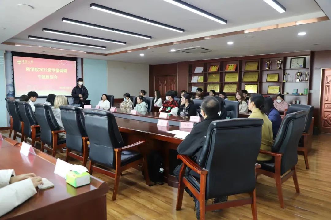 2023年3月1日上午,商学院在金家岭校区办公楼310会议室,召开2022级学情调研暨学风建设专题座谈会,商学院党委副书记尼梅颉、学工办主任李鹏以及商学院2022级40名学生代表参加座谈会。