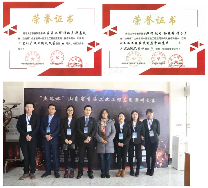 12月8日,2018 年山东省工业工程类专业建设与先进制造高峰论坛 ——“杰瑞杯”山东省首届工业工程应用案例大赛于2018年12月8日在山东工商学院召开。我系2016级工业工程专业陈家豪、褚皓月、陈祥和2016级物流专业张志成组成的IEIS团队,2016级工业工程专业孙晓婷、王保骄、张子月、赵妤、丛铭组成的青新IE团队均在温艳老师、张磊老师的指导下荣获三等奖。这是我省举办的首个针对工业工程专业的应用型案例大赛,目的在于积极倡导、引领和推进工业工程类专业建设,统筹各方力量,构建全方位全过程深融合的协同育人新机制,促进山东省高校工业工程教育的创新改革和人才培养。