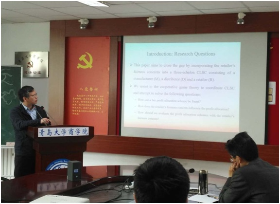 5月14日上午,加拿大温莎大学Odette商学院管理科学教授李武(Kevin W. Li)博士和加拿大瑞尔森大学(Ryerson University)机械和工业工程系教授方黎平院士来商学院学院交流访问,并先后在商学院办公楼310会议室为学院师生作了题为《协调具有公平关切的三阶闭环供应链的合作博弈方法》和《提前的电力峰值和价格》预测的学术报告,报告会由管科系主任王磊教授主持,其他参与会议的老师有张桂涛副教授、孙浩副教授、马骋副教授、贺华老师、温艳老师和数学学院代业明副教授、中国海洋大学经济学院李雪梅副教授。