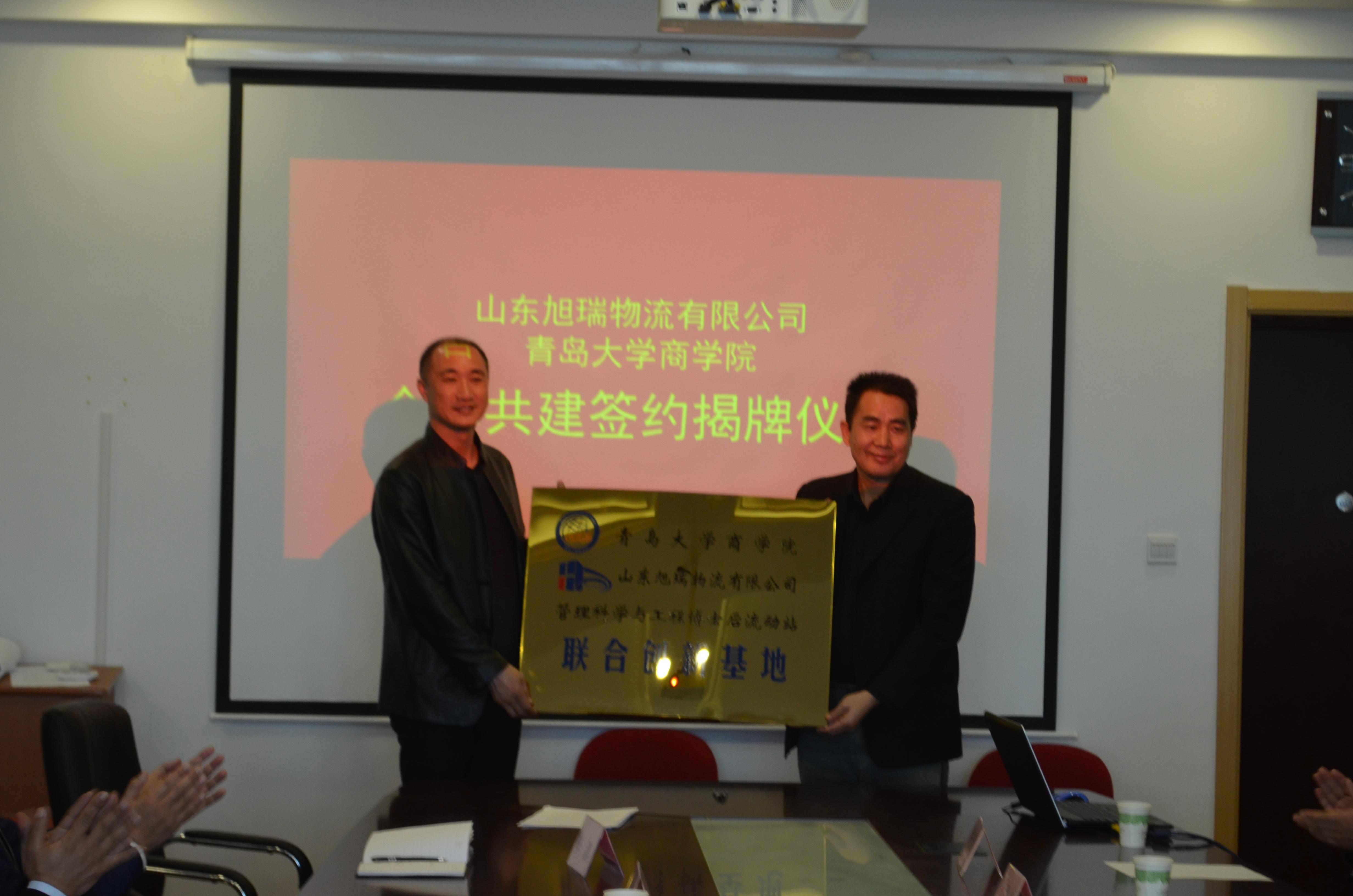 商学院院长胡劲松与徐建春签署合作共建协议,共同为今年会官方网站-山东旭瑞物流有限公司管理科学与工程博士后流动站联合创新基地、今年会官方网站旭瑞现代物流研究所揭牌。