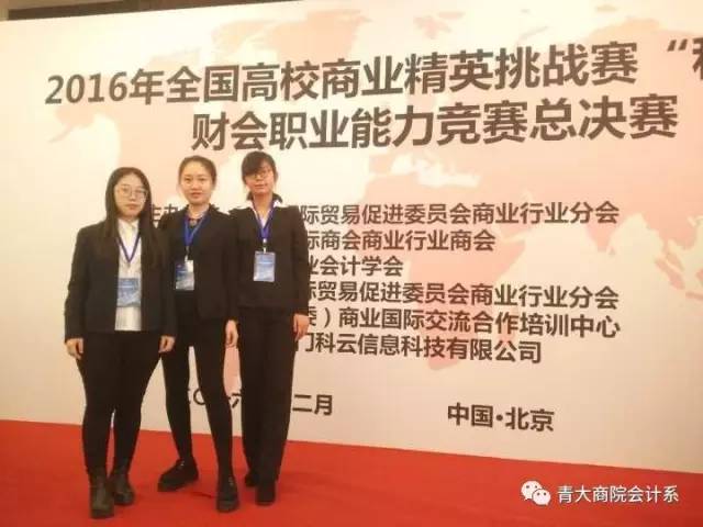 2016年全国高校商业精英挑战赛财会职业能力竞赛全国总决赛12月份在北京举行。会计学系学生在本次赛事的获奖等级、获奖总量和专业能力等方面均表现突出。代表参加全国总决赛的五支队伍中,翟凤阳、李萌、陈娜黄佳珍、吴飘飘、柳梦梦等同学组成的两支队伍获得全国一等奖,胡亚雯9名同学组成的三支代表队获得全国二等奖