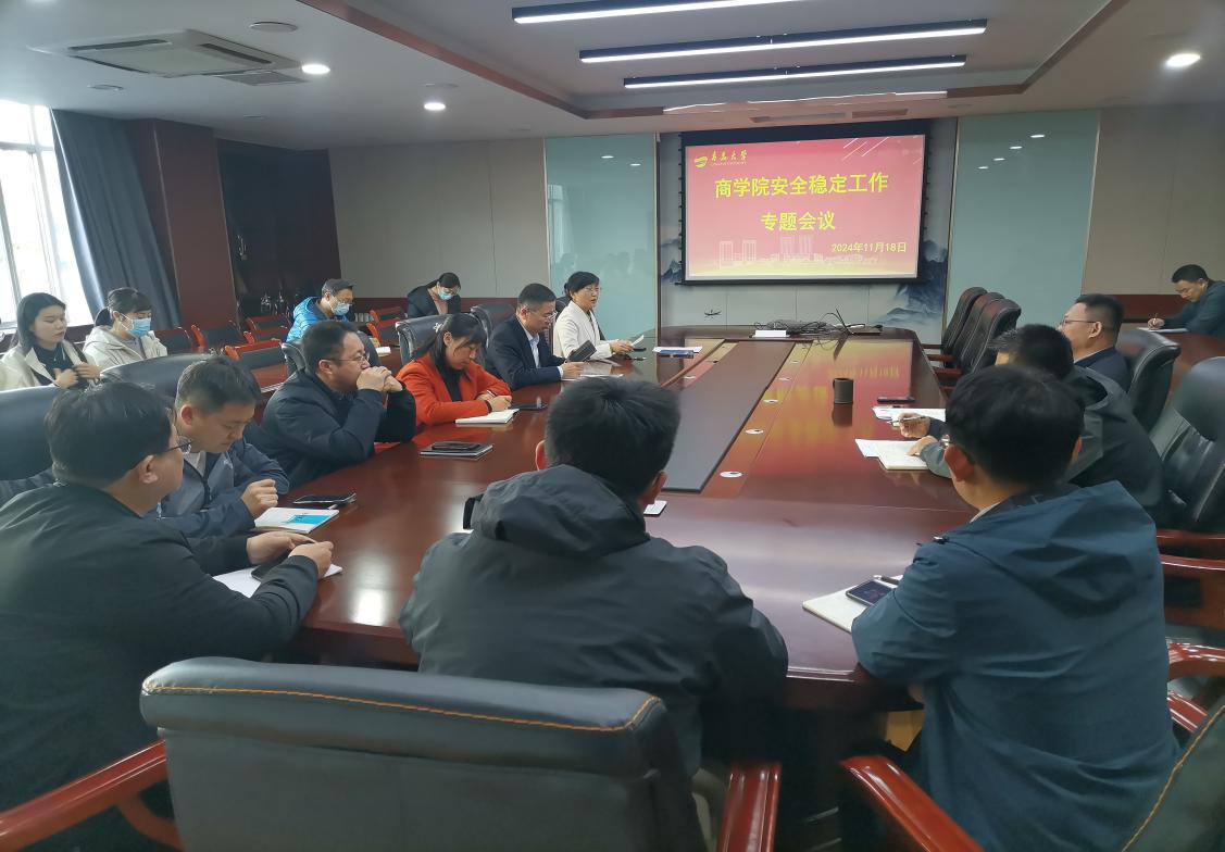 2024年11月18日下午3:00,商学院安全稳定工作专题会议在310会议室召开。学院党委书记王庆金主持会议,党委委员、班子成员、各党支部书记、各系(中心)主任以及全体辅导员参加会议。