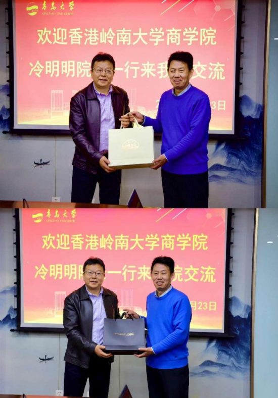 会谈交流后双方互赠礼物,共同纪念这次宝贵而圆满的会面。本次交流会,不仅深化了两校间的沟通,增进了友谊,更开拓了两个学院之间的合作思路与合作空间。双方都希望今后在此基础上,继续加强合作,共同努力,为国家高质量商科人才培养和科学研究贡献力量。