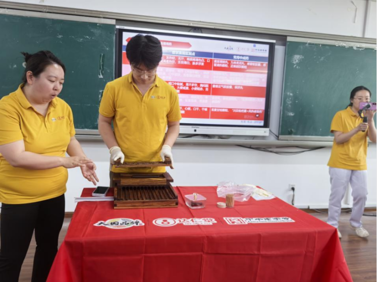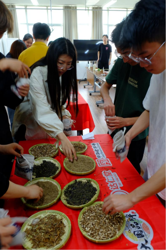 活动邀请天津医药集团金牌企业文化大使、天津市青年岗位能手张瑶老师以“端午时节防暑热,草药提神护安康”为主题,结合《黄帝内经》夏季养生理念,详解艾叶、薄荷、佩兰等端午特色药材的提神醒脑功效,并针对高温易发的头晕倦怠、湿热困乏等症状,教授师生科学配伍香囊的实用技巧。“原来端午挂艾草不仅是习俗,更是古人防病养生的‘天然方案’!”在场学生纷纷表示收获颇丰。