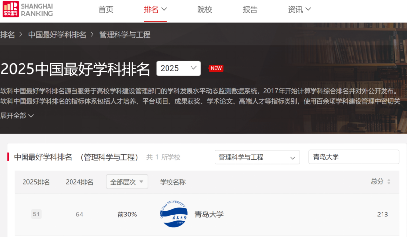 2025年10月15日,高等教育评价专业机构软科正式发布“2025软科中国最好学科排名”。榜单显示,我院管理科学与工程学科位列全国第51名,较去年强势提升13个位次,连续两年跻身全国前30%行列,实现了历史性突破。这标志着该学科在师资力量、人才培养、科研创新以及社会服务等多个维度实现全面跃升,学科实力与核心竞争力获得权威认可。