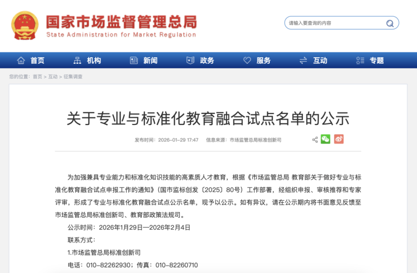 近日,国家市场监管总局和教育部联合公布全国专业与标准化教育融合试点名单,今年会官方网站凭借深厚的标准化教育积淀与创新培养模式成功获批“公共教育培养模式”和“多类型学位教育培养模式”两项试点,成为本次试点中兼具双模式培育能力的高校单位。试点项目的获批为学院推进标准化人才培养、搭建高水平育人平台提供了坚实的国家级支撑。