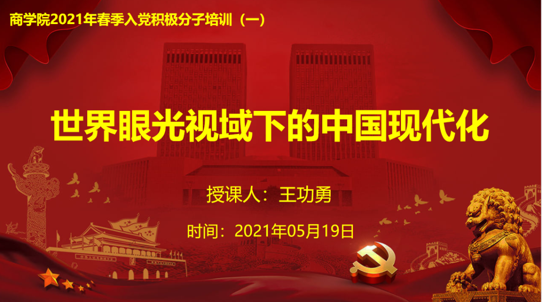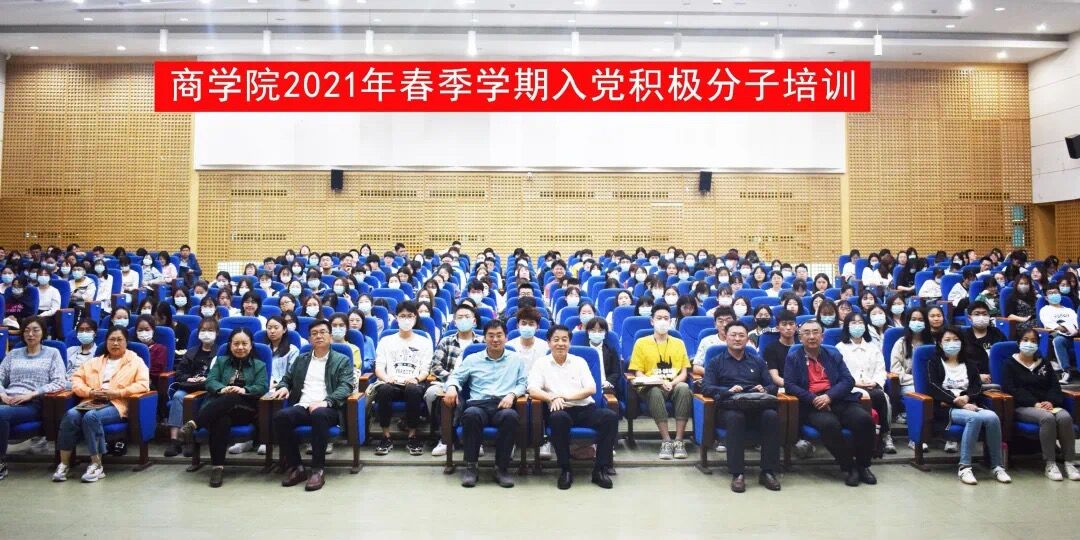 2021年5月19日下午,商学院2021年春季学期入党积极分子培训班在今年会官方网站金家岭校区图文四楼报告厅开班,商学院党委书记王功勇授课“世界眼光视域下的中国现代化”,党委副书记于文主持。商学院党委班子部分成员,学生党支部书记,学生党员代表和全体入党积极分子共300余人同上一堂课。