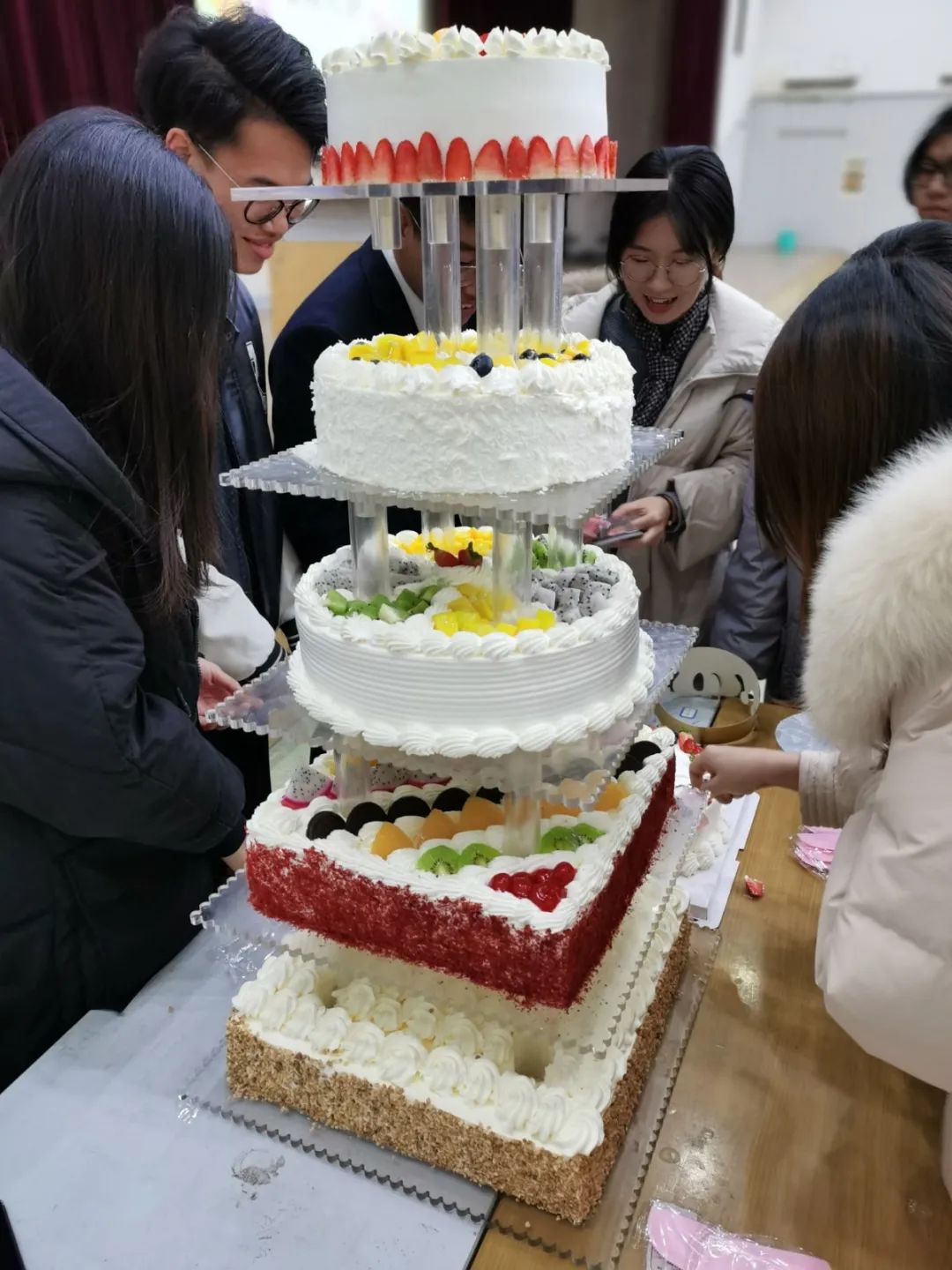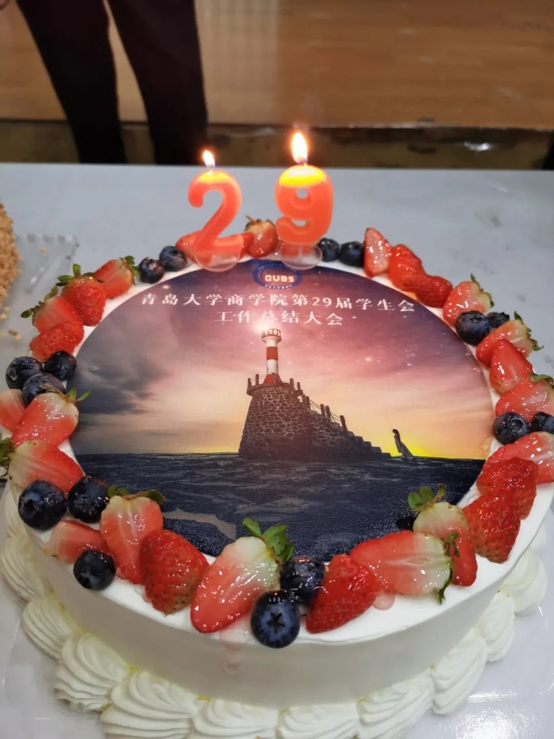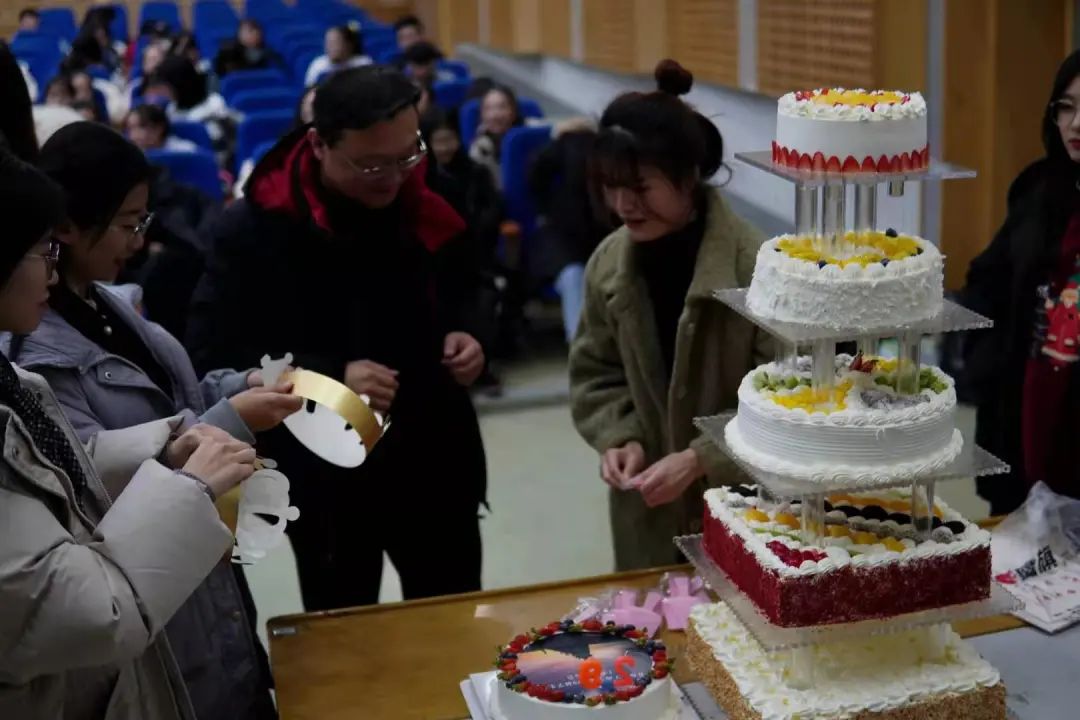 接下来是大家都期待已久的切分蛋糕的时候了姜老师和学生会主席团的各位成员,走到舞台前,在蛋糕上点燃蜡烛,庆祝这一年工作的顺利结束,以及预祝明年一切的工作都可以顺顺利利、再创辉煌。吹灭蜡烛后,办公室的同学们便来切分蛋糕,确保每一位同学都可以分到美味的蛋糕。再接下来的是各部门的展示环节,各部门的代表上台展示自己部门的职责、成员还有这一年的工作经历。
