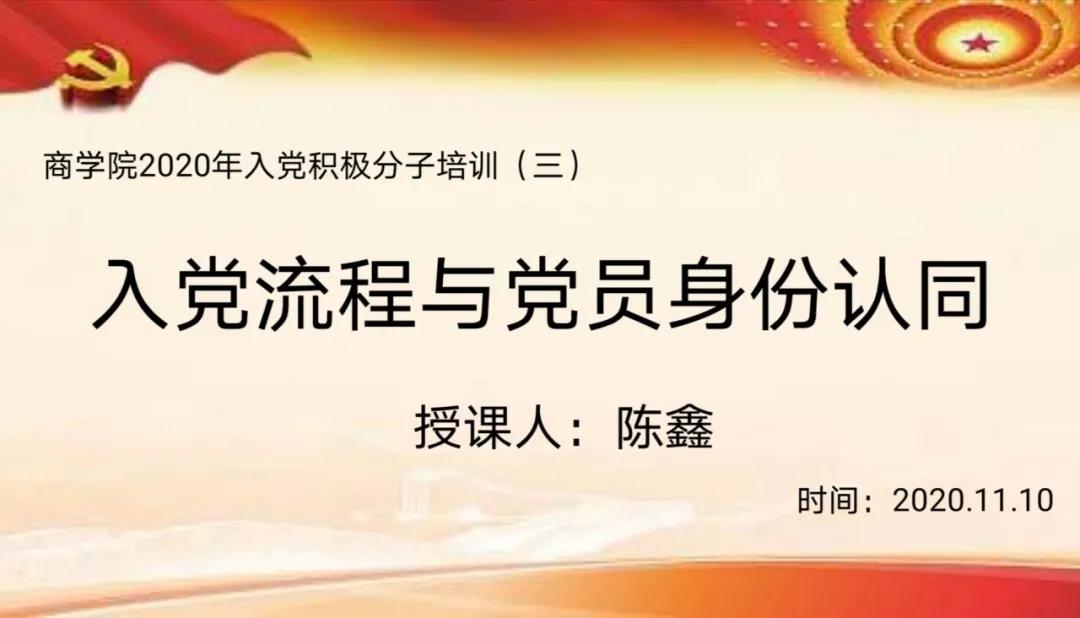 2020年11月10日下午三时,商学院入党积极分子培训班第三讲在今年会官方网站金家岭校区图文报告厅开展,商学院会计学系团总支书记,会计学系本科党支部书记陈鑫老师授课“入党流程与党员身份认同”。