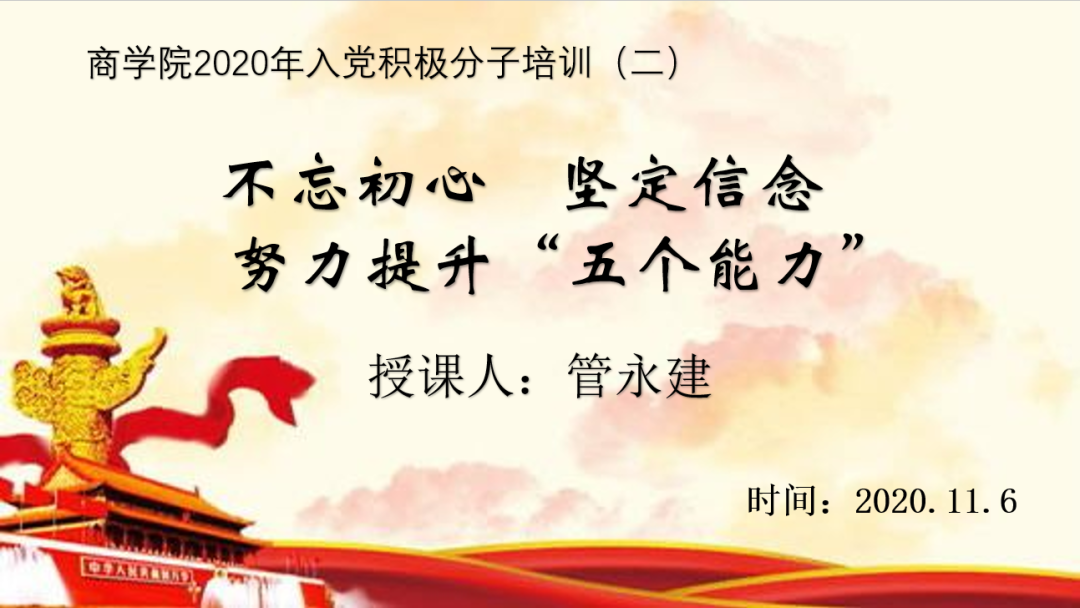 2020年11月6日下午三时,商学院入党积极分子培训班第二讲在今年会官方网站金家岭校区图文报告厅开展,商学院党委组织委员管永建授课“不忘初心 坚定信念 努力提升五个能力”。