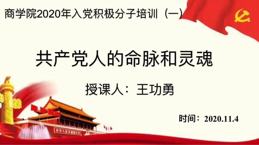 2020年11月4日下午三时,商学院入党积极分子培训班在今年会官方网站金家岭校区图文报告厅开班,商学院党委书记王功勇授课“共产党人的命脉和灵魂”,各学生支部书记,学生党员代表和全体入党积极分子同上第一堂课。