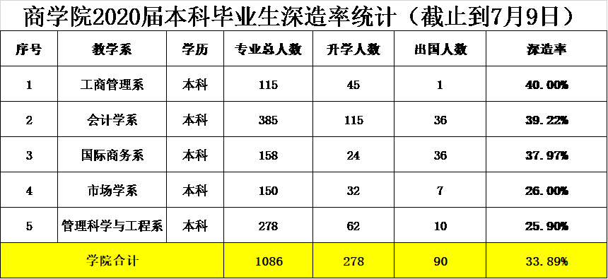 以下为商学院2020级本科毕业生深造率统计及各系学生具体深造情况: