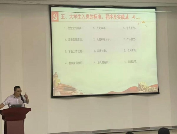 张启春老师向同学们介绍了入党程序和我校发展党员工作实施细则,强调作为新时代的学生,要积极向党组织靠拢,不仅是一种荣誉, 更是一种责任。