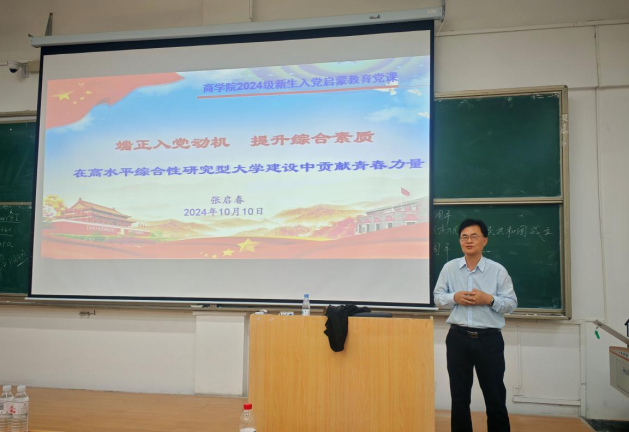 2024年10月10日下午, 第一场新生入党启蒙教育大会在金家岭校区西院1教111举行,商学院组织员张启春老师主讲,2024级会计学、管理科学与工程和供应链三个专业共211名新生聆听了此次讲座。
