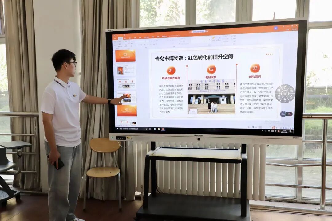陈馨茹带领的“红旅融合”实践团队聚焦红色研学与高校思政协同发展这一核心议题,分享了崂山党史馆存在的供需错位现实困境,以及青岛市博物馆红色转化的提升空间等情况。在此基础上,团队提出了健全统筹协同机制、搭建多方联动平台,进行线路重组与主题矩阵构建等举措,为红色资源更高效赋能高校思政教育探索了可行路径。