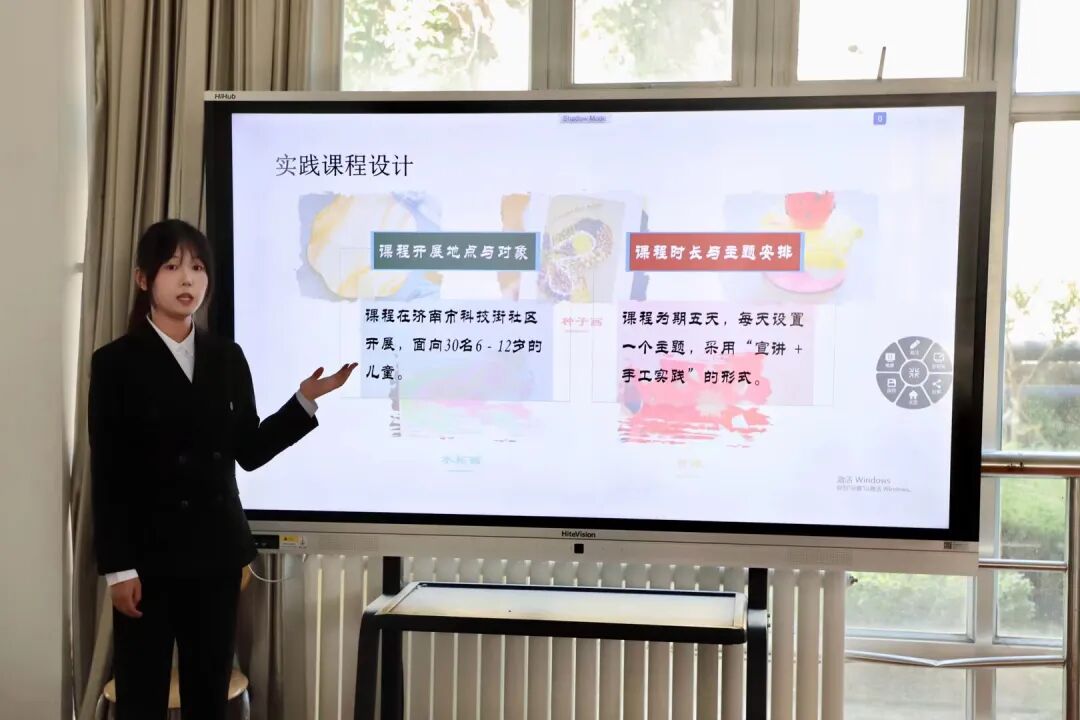 葛美声带领的“商韵承华”实践团携“传统文化浸润童心”项目,聚力于青少年文化自信培育,在济南市开设“宣讲+手工实践”课程,用水拓画、种子画等形式让孩子们深入感受传统文化魅力。答辩中呈现的实践过程与育人成效,展现出了项目助力文化自信扎根童心的扎实成果。