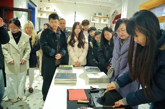 2025年12月11日下午,商学院学生党支部部分师生代表走进被誉为“城市文化客厅”的里院美术馆,开展“美育润心田,党建塑新风”联合主题党日活动。本次活动由学生第七党支部承办,商学院党委副书记尼梅颉、各学生党支部书记、辅导员以及学生党员代表参加。活动通过“看、印、谈”三堂课,推动美育活动与党建工作的深度融合,让青年党员在审美浸润中筑牢信仰之基,在文化践行中砥砺初心使命。