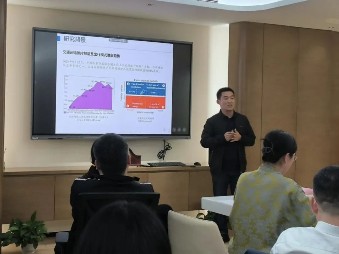 商学院教师代表王栋分享了“双碳”目标下的城市道路交通管理,围绕共享、电动汽车服务展开阐释,并对未来电动汽车及自动驾驶的普及以及碳中和的达成指明了方向。他对山东行健集团的发展壮大心怀敬慕,并对商学院各位领导的关心表达了由衷的感谢。