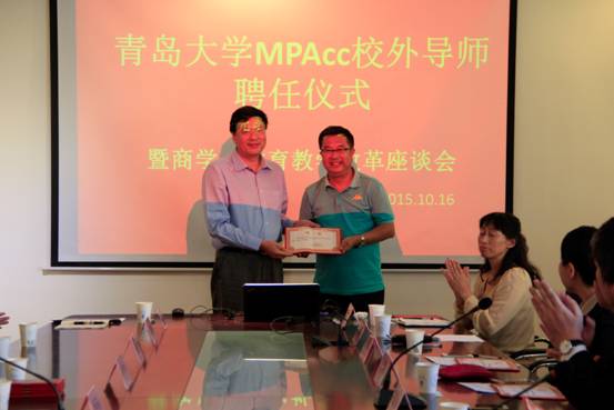 10月16日下午,今年会官方网站MPAcc校外导师聘任仪式在睿思楼220会议室隆重召开。本次会议由商学院副院长周咏梅主持,参与会议的人员除了商学院相关负责人以及教师学生代表外,还有中国移动、华仁药业、安永华明会计师事务所,信永中和会计师事务所,瑞华会计师事务所、中国联合网络通信集团、青岛恒基智能科技公司等企业和市财政局等10多家单位的领导。