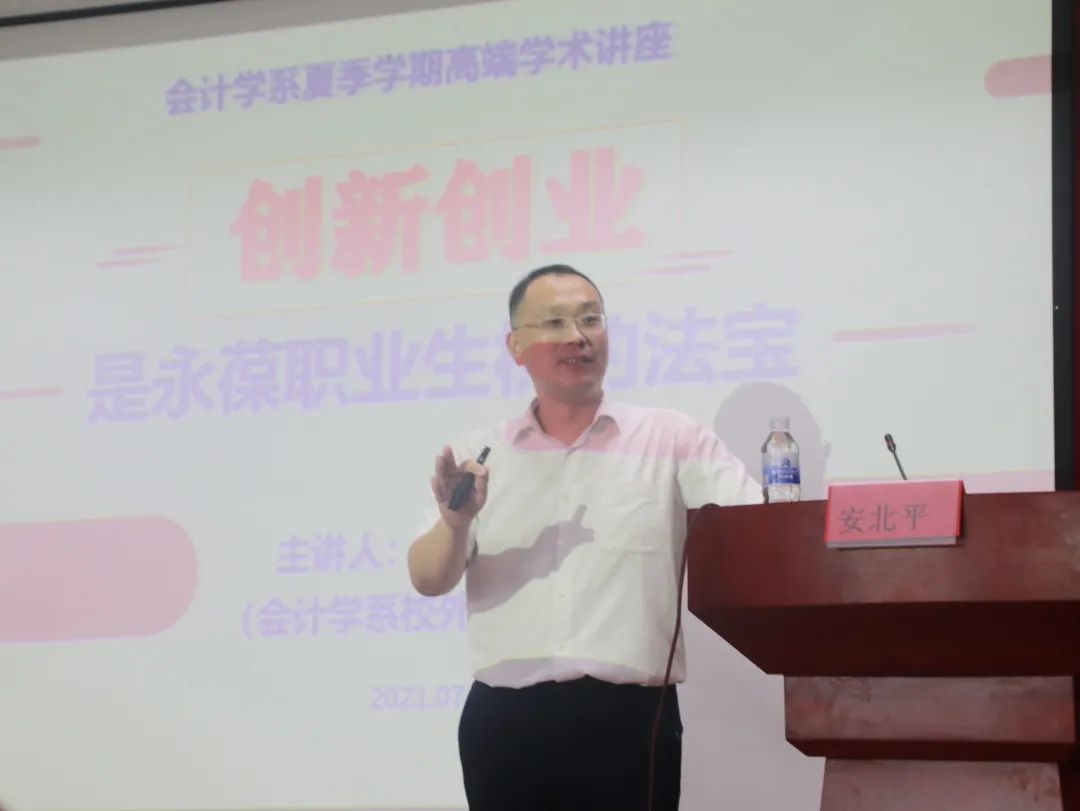 7月12日上午9点到11点半会计学系部分老师和19、20级全体212名同学在图文中心三楼报告厅参加了以“创新创业是永葆职业生机的法宝”为主题的夏季学期高端学术讲座,主讲人为会计学系校外实践导师安北平师兄。